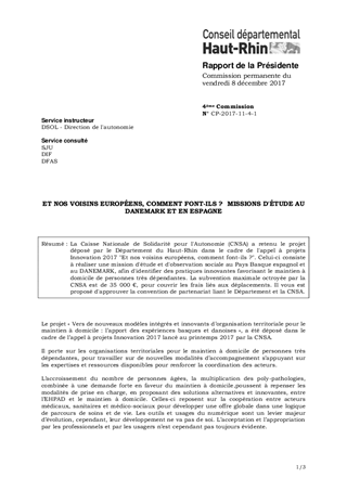 La Caisse Nationale de Solidarité pour l'Autonomie (CNSA) a retenu le projet déposé par le Département du Haut-Rhin dans le cadre de l'appel à projets Innovation 2017 "Et nos voisins européens, comment font-ils ?". Celui-ci consiste à réaliser une mission d'étude et d'observation sociale au Pays Basque espagnol et au DANEMARK, afin d'identifier des pratiques innovantes favorisant le maintien à domicile de personnes très dépendantes. La subvention maximale octroyée par la CNSA est de 35 000 €, pour couvrir les frais liés aux déplacements. Il vous est proposé d'approuver la convention de partenariat liant le Département et la CNSA.