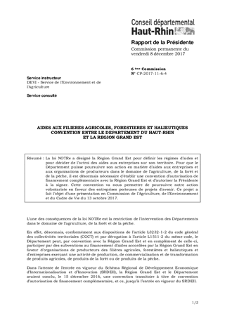 AIDES AUX FILIERES AGRICOLES, FORESTIERES ET HALIEUTIQUESCONVENTION ENTRE LE DEPARTEMENT DU HAUT-RHINET LA REGION GRAND EST