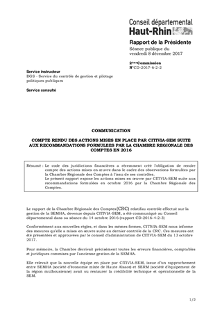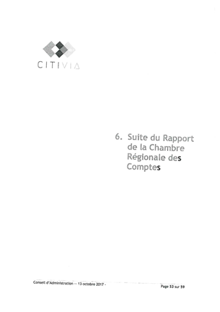 COMMUNICATIONCOMPTE RENDU DES ACTIONS MISES EN PLACE PAR CITIVIA-SEM SUITE AUX RECOMMANDATIONS FORMULEES PAR LA CHAMBRE REGIONALE DES COMPTES EN 2016