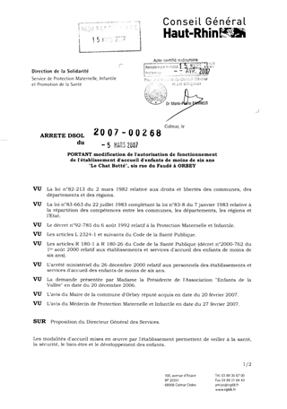 portant modification de l'autorisation de fonctionnement de l'établissement d'accueil d'enfants de moins de six ans "Le Chat Botté", sis rue du Faudé à ORBEY. Resumé Pièces jointes ARRETE Assemblée : Non défini Date : 05/03/2007 Rapporteur : Non défini Collectivité : Conseil départemental du Haut-Rhin Direction : Non défini Service : Service de Protection Maternelle et Infantile Domaine : Accueil d'enfants Commission :