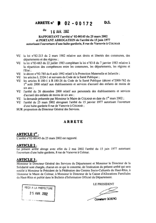 Rapportant l'arrêté n° 02-00145 du 25 mars 2002 et portant abrogation de l'arrêté du 15 juin 1977 autorisant l'ouverture d'une halte-garderie, 8 rue de Varsovie à COLMAR Resumé Pièces jointes ARRETE Assemblée : Non défini Date : 16/04/2002 Rapporteur : Non défini Collectivité : Conseil départemental du Haut-Rhin Direction : Non défini Service : Service de Protection Maternelle et Infantile Domaine : Accueil d'enfants Commission :