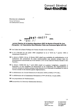 portant fixation de la dotation dépendance 2007 du service d'accueil de jour "Escapades" de l'association haut-rhinoise d'aide aux personnes âgées (APA 68). Resumé Pièces jointes ARRETE Assemblée : Non défini Date : 08/03/2007 Rapporteur : Non défini Collectivité : Conseil départemental du Haut-Rhin Direction : Non défini Service : Service de la Tarification des Etablissements Domaine : Dotations financières Commission :
