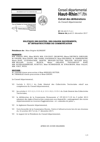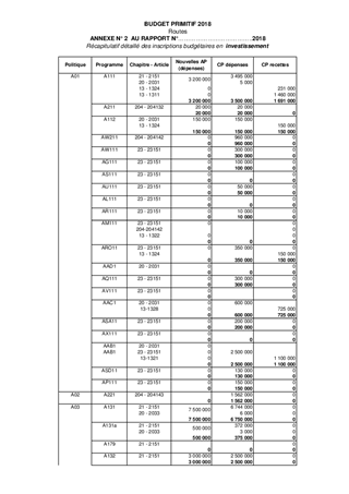 Le rapport présente les propositions du budget 2018 pour l’ensemble des dépenses et recettes afférentes aux politiques en faveur des routes, des grands équipements et des infrastructures de communications. Dans ces domaines, le budget 2018 est marqué par : - une augmentation du budget dédié à l’entretien et à la maintenance (17,9 M€ en investissement), - le démarrage du basculement de la radio analogique vers le numérique, - la réalisation de l’échangeur A 35/RD 66 à BARTENHEIM, - les aménagements pour les transports exceptionnels entre BELFORT et STRASBOURG, - la poursuite des études pour la RD 105 dans le cadre de l’aménagement du Technoport à SAINT-LOUIS, - la poursuite du projet Très Haut Débit Alsace visant à déployer la fibre optique à l’horizon 2022 dans toutes les communes relevant de la zone d’initiative publique. Le Département du Haut-Rhin participe ainsi à ce double objectif de réduction de la fracture numérique et de développement économique de son territoire, - le soutien en faveur des équipements de transport aérien et ferroviaire, - la finalisation des études préalables à l’enquête publique dans le cadre du raccordement ferroviaire de l'EuroAirport. Ce projet contribuera au développement du territoire tri-national du Rhin Supérieur en confortant la compétitivité de l’EuroAirport. Au plan budgétaire, le montant global des crédits de paiement s’élève à un total de 38 911 831 € toutes dépenses confondues, dont 37 484 000 € pour les routes et 1 427 831 € pour les grands équipements et infrastructures de communications. Le montant global des autorisations de programme s’élève à un total de 24 800 000 € (24 360 000 € pour les routes et 440 000 € pour les grands équipements et infrastructures de communications). En ce qui concerne les dépenses de fonctionnement, les crédits de paiement 2018 s’élèvent à 8 023 000 €, dont notamment 5 458 000 € pour l’entretien courant du réseau routier (hors VH) et 2 400 000 € pour la viabilité hivernale. Pour les dépenses d’investissement, les crédits de paiement 2018 s’élèvent à un total de 30 888 831 € dont 29 521 000 € pour les routes et 1 367 831 € pour la politique en faveur des grands équipements et des infrastructures de communications. Dans le cadre de la démarche du projet de service « Routes 2025 », un calendrier prévisionnel des opérations prioritaires a été établi pour préciser le cadrage budgétaire 2018-2027 du volet routier du Plan Pluriannuel d’Investissement (PPI) départemental.