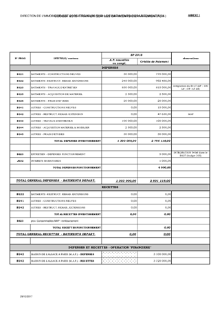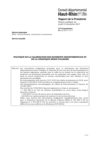 Les inscriptions budgétaires proposées pour la valorisation des bâtiments départementaux (hors collèges), le maintien de leur bon état de fonctionnement et les besoins logistiques associés sont le reflet de la volonté de la collectivité de préserver son patrimoine immobilier tout en optimisant ses usages. Pour cela, la mise en œuvre d’opérations et actions caractérisées par leur sobriété et leur pérennité sera privilégiée. En investissement sont inscrits 3 813 618 € de crédits de paiement en 2018, pour lesquels 2 040 000 € d’AP nouvelles ou complémentaires sont à valider. Ces investissements s’accompagnent de crédits de fonctionnement à hauteur de 10 089 400 € Des recettes de 5 928 000 € figurent également au bilan et notamment : - 4 562 000 € au titre de cessions immobilières en cours (dont vente Espace Renault à Colmar), - 1 046 000 € au titre de locaux mis à la disposition de tiers, - 320 000 € en remboursement de sinistres ou de recettes diverses. Enfin, sont inscrits des mouvements budgétaires complémentaires liés, d’une part, à l’opération financière de la Maison d’Alsace (MAP) (3 100 000 € HT en dépenses et 3 720 000 € TTC en recettes), et d’autre part à la vente à paiement différé de la sous-préfecture de Mulhouse (549 000 €).