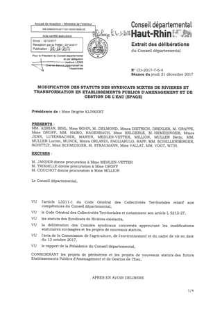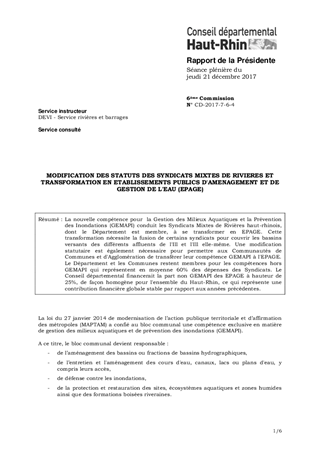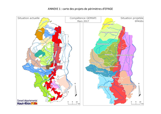 La nouvelle compétence pour la Gestion des Milieux Aquatiques et la Prévention des Inondations (GEMAPI) conduit les Syndicats Mixtes de Rivières haut-rhinois, dont le Département est membre, à se transformer en EPAGE. Cette transformation nécessite la fusion de certains syndicats pour couvrir les bassins versants des différents affluents de l'Ill et l'Ill elle-même. Une modification statutaire est également nécessaire pour permettre aux Communautés de Communes et d'Agglomération de transférer leur compétence GEMAPI à l'EPAGE. Le Département et les Communes restent membres pour les compétences hors GEMAPI qui représentent en moyenne 60% des dépenses des Syndicats. Le Conseil départemental financerait la part non GEMAPI des EPAGE à hauteur de 25%, de façon homogène pour l'ensemble du Haut-Rhin, ce qui représente une contribution financière globale stable par rapport aux années précédentes.