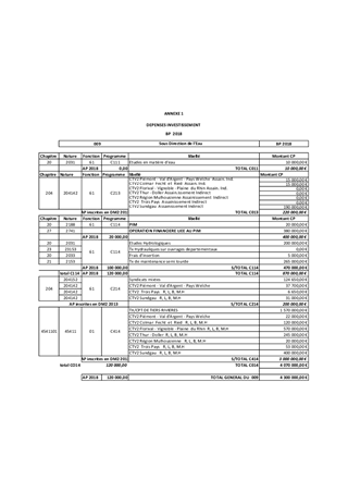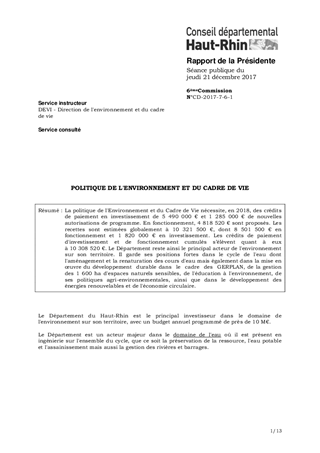 La politique de l'Environnement et du Cadre de Vie nécessite, en 2018, des crédits de paiement en investissement de 5 490 000 € et 1 285 000 € de nouvelles autorisations de programme. En fonctionnement, 4 818 520 € sont proposés. Les recettes sont estimées globalement à 10 321 500 €, dont 8 501 500 € en fonctionnement et 1 820 000 € en investissement. Les crédits de paiement d'investissement et de fonctionnement cumulés s’élèvent quant à eux à 10 308 520 €. Le Département reste ainsi le principal acteur de l'environnement sur son territoire. Il garde ses positions fortes dans le cycle de l'eau dont l'aménagement et la renaturation des cours d'eau mais également dans la mise en œuvre du développement durable dans le cadre des GERPLAN, de la gestion des 1 600 ha d'espaces naturels sensibles, de l'éducation à l'environnement, de ses politiques agri-environnementales, ainsi que dans le développement des énergies renouvelables et de l'économie circulaire.