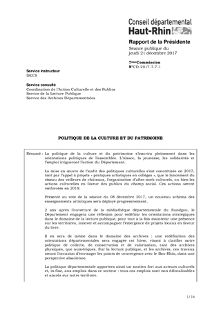 La politique de la culture et du patrimoine s’inscrira pleinement dans les orientations politiques de l’assemblée. L’Alsace, la jeunesse, les solidarités et l’emploi irrigueront l’action du Département. La mise en œuvre de l’audit des politiques culturelles s’est concrétisée en 2017, tant par l’appel à projets « pratiques artistiques en collèges », que le lancement du réseau des veilleurs de châteaux, l’organisation d’after-work culturels, ou bien les actions culturelles en faveur des publics du champ social. Ces actions seront renforcées en 2018. Présenté au vote de la séance du 08 décembre 2017, un nouveau schéma des enseignements artistiques sera déployé progressivement. 2 ans après l’ouverture de la médiathèque départementale du Sundgau, le Département engagera une réflexion pour redéfinir les orientations stratégiques dans le domaine de la lecture publique, pour tout à la fois maintenir une présence sur les territoires, innover et accompagner l’émergence de projets locaux en faveur du livre. Il en sera de même dans le domaine des archives : une redéfinition des orientations départementales sera engagée cet hiver, visant à clarifier notre politique de collecte, de conservation et de valorisation, tant des archives physiques, que numériques. Sur la lecture publique, et les archives, ces travaux seront l’occasion d’envisager les points de convergence avec le Bas-Rhin, dans une perspective alsacienne. La politique départementale apportera ainsi un soutien fort aux acteurs culturels et, in fine, aux emplois dans ce secteur : tous ces emplois sont non délocalisables et ancrés sur notre territoire. Pour l’ensemble de ces actions, le budget consacré à la politique culturelle et patrimoniale s’élève en 2018 à 7 147 450 € en dépenses : - 6 197 450 € en fonctionnement, - 950 000 € en investissement, Et à 151 593 € en recettes : - 150 193 € en fonctionnement, - 1 400 € en investissement.