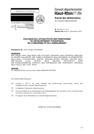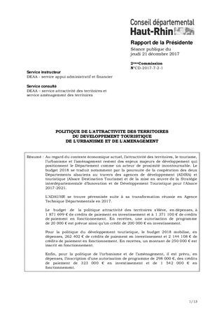 Au regard du contexte économique actuel, l’attractivité des territoires, le tourisme, l’urbanisme et l’aménagement restent des enjeux majeurs de développement qui positionnent le Département comme un acteur de proximité incontournable. Le budget 2018 se traduit notamment par la poursuite de la coopération des deux Départements alsaciens au travers des agences de développement (ADIRA) et touristique (Alsace Destination Tourisme) et de la mise en œuvre de la Stratégie interdépartementale d’Innovation et de Développement Touristique pour l'Alsace 2017-2021. L’ADAUHR se trouve pérennisée suite à sa transformation réussie en Agence Technique Départementale en 2017. Le budget de la politique attractivité des territoires s’élève, en dépenses, à 1 871 699 € de crédits de paiement en investissement et à 1 371 100 € de crédits de paiement en fonctionnement. En recettes, une autorisation de programme de 20 000 € est prévue ainsi qu’un crédit de 200 000 € en investissement. Pour la politique du développement touristique, le budget 2018 mobilise, en dépenses, 262 402 € de crédits de paiement en investissement et 2 144 108 € de crédits de paiement en fonctionnement. En recettes, un montant de 250 000 € est inscrit en fonctionnement. Enfin, pour la politique de l’urbanisme et de l’aménagement, il est prévu, en dépenses, l’inscription d’une autorisation de programme de 298 000 €, des crédits de paiement de 323 000 € en investissement et de 1 542 000 € en fonctionnement.