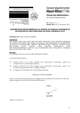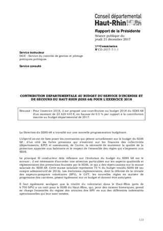 CONTRIBUTION DEPARTEMENTALE AU BUDGET DU SERVICE D'INCENDIE ET DE SECOURS DU HAUT-RHIN (SDIS 68) POUR L'EXERCICE 2018