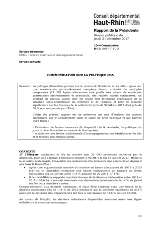 La politique d’insertion portant sur le revenu de Solidarité active (rSa) repose sur une construction particulièrement complexe devant articuler de multiples composants (17 378 foyers allocataires aux profils très divers, de nombreux partenariats institutionnels et associatifs, des réalités locales contrastées, un système de gestion lourd). Elle est avant tout fortement dépendante de la situation socio-économique du territoire et de l’emploi, et pèse de manière significative sur les finances de la collectivité (près de 92 M€ en 2017 dont près de 50 % non compensés par l’Etat). L’objet du présent rapport est de présenter un tour d’horizon des actions entreprises par le Département dans le cadre de cette politique et qui portent leurs fruits : - l’activation de leviers innovants (le dispositif rSa & bénévolat, la politique du juste droit et le soutien au monde de l’entreprise) ; - le maintien des leviers traditionnels (l’accompagnement des bénéficiaires du rSa et le recours aux emplois aidés).