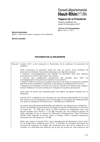 L’année 2017 a été consacrée à l’évaluation de la politique de protection de l’enfance. 2018 constituera la première année de mise en œuvre d’une politique de protection de l’enfance renouvelée répondant aux objectifs suivants : • renforcer l’accompagnement des familles en proximité dans leur fonction parentale pour éviter le placement des enfants, • assurer une qualification permanente des équipes pour offrir un accompagnement de qualité aux familles et aux enfants, • adapter l’offre de services en matière d’accueil et de prise en charge des enfants placés et de leurs familles et répondre à des besoins insuffisamment couverts, • disposer d’un pilotage structuré pour mieux connaître les besoins des usagers, évaluer l’efficience de notre politique et s’adapter de manière permanente. Cette mise en œuvre sera possible grâce aux efforts de gestion réalisés par la Solidarité. L’année 2017 a également été marquée par une hausse exponentielle de l’accueil des mineurs non accompagnés avec une incidence à la hausse des dépenses liées à la prise en charge de ces mineurs de + 2,88 M€ pour le BP 2018. Au niveau des allocations individuelles de solidarité, les tendances se confirment. Grâce à la politique de juste droit et la baisse du nombre d’allocataires, le rSa sera en baisse de 2,1 M€ pour 2018. La PCH continue sa progression avec une hausse estimée pour 2018 à + 2,35 M€ atténuée par une meilleure gestion de l’aide ménagère et par la baisse de l’Allocation Compensatrice Tierce Personne (ACTP). Sans dégrader le service rendu à l’usager, l’APA à domicile demeurera maîtrisée avec une baisse de - 0,9 M€. Enfin, par rapport à l’année 2017, deux changements de périmètres sont à noter sur le budget de la solidarité pour 2018 : le transfert du transport des élèves en situation de handicap du budget des transports vers celui de la solidarité et le transfert à la Direction des finances, de la part de recette de Taxe Intérieure de Consommation sur les Produits Energétiques (TICPE) non relative à la compensation du rSa. Sur la base du nouveau périmètre 2018 du budget de la Solidarité, l’évolution globale, en net, affiche ainsi une hausse par rapport au BP 2017 de +12,6 M€, soit +4,8%. A isopérimètre, les dépenses nettes de fonctionnement de la Solidarité sont en hausse de + 1,7 M€ (+0,7%). A isopérimètre et hors impact budgétaire de la hausse du nombre de mineurs non accompagnés (+ 2,9 M€), les dépenses nettes de fonctionnement de la Solidarité affichent une baisse de -1,2 M€ (soit -0,4%).
