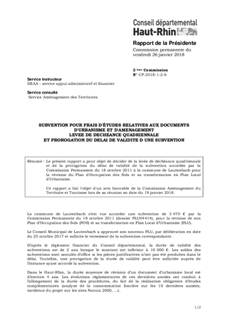 Le présent rapport a pour objet de décider de la levée de déchéance quadriennale et de la prorogation du délai de validité de la subvention accordée par la Commission Permanente du 18 octobre 2011 à la commune de Lautenbach pour la révision du Plan d'Occupation des Sols et sa transformation en Plan Local d'Urbanisme. Ce rapport a fait l'objet d'un avis favorable de la Commission Aménagement du Territoire et Tourisme lors de sa réunion en date du 19 janvier 2018.