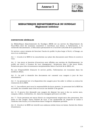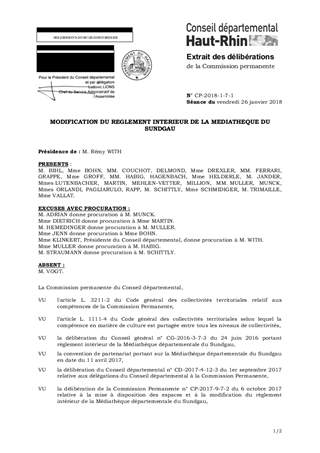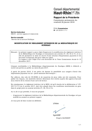 Le présent rapport a pour objet d’approuver la modification du règlement intérieur de la Médiathèque du Sundgau et notamment ses articles 27, 38, 40 et 41, et ce, afin de permettre la mise en œuvre d'une solution d’impressions payantes et de sécuriser l’utilisation des jeux vidéo sur place. Ce rapport a fait l’objet d’un avis favorable de la 7ème Commission réunie le 15 décembre 2017.