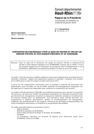Dans le cadre de la réalisation du projet de mission d'étude et d'observation sociale au Pays Basque espagnol et au DANEMARK, soutenu par la CNSA, il vous est proposé d'approuver la convention de partenariat liant le Département et ses partenaires, définissant les modalités pratiques de mise en œuvre du projet.