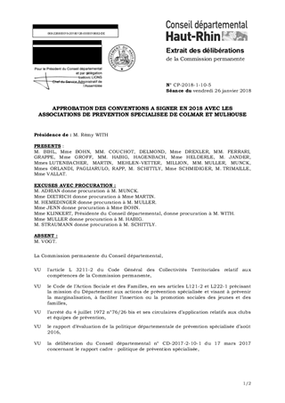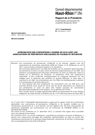 APPROBATION DES CONVENTIONS A SIGNER EN 2018 AVEC LES ASSOCIATIONS DE PREVENTION SPECIALISEE DE COLMAR ET MULHOUSE