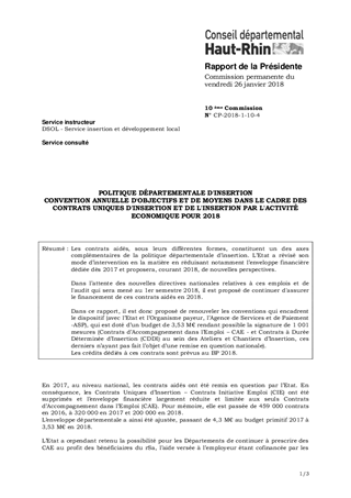 POLITIQUE DÉPARTEMENTALE D'INSERTIONCONVENTION ANNUELLE D'OBJECTIFS ET DE MOYENS DANS LE CADRE DES CONTRATS UNIQUES D'INSERTION ET DE L'INSERTION PAR L'ACTIVITÉ ECONOMIQUE POUR 2018