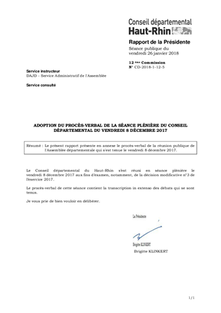 Le présent rapport présente en annexe le procès-verbal de la réunion publique de l'Assemblée départementale qui s'est tenue le vendredi 8 décembre 2017.