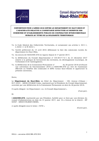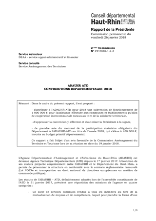 Dans le cadre du présent rapport, il est proposé : - d'attribuer à l'ADAUHR-ATD pour 2018 une subvention de fonctionnement de 1 000 000 € pour l'assistance effectuée aux communes et établissements publics de coopération intercommunale ruraux au titre de la solidarité territoriale, - d'approuver la convention y afférente et d'autoriser la Présidente à la signer, - de prendre acte du montant de la participation statutaire obligatoire du Département à l'ADAUHR-ATD au titre de l'année 2018, qui s'élève à 450 000 €, inscrits au budget primitif départemental. Ce rapport a fait l'objet d'un avis favorable de la Commission Aménagement du Territoire et Tourisme lors de sa réunion en date du 19 janvier 2018.