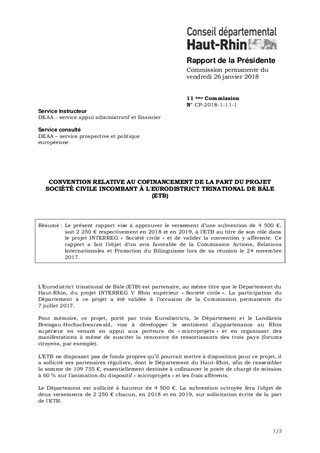 CONVENTION RELATIVE AU COFINANCEMENT DE LA PART DU PROJET SOCIÉTÉ CIVILE INCOMBANT À L'EURODISTRICT TRINATIONAL DE BÂLE (ETB)
