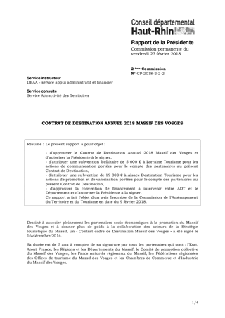 Le présent rapport a pour objet : - d'approuver le Contrat de Destination Annuel 2018 Massif des Vosges et d'autoriser la Présidente à le signer, - d'attribuer une subvention forfaitaire de 5 000 € à Lorraine Tourisme pour les actions de communication portées pour le compte des partenaires au présent Contrat de Destination, - d'attribuer une subvention de 19 300 € à Alsace Destination Tourisme pour les actions de promotion et de valorisation portées pour le compte des partenaires au présent Contrat de Destination, - d'approuver la convention de financement à intervenir entre ADT et le Département et d'autoriser la Présidente à la signer. Ce rapport a fait l'objet d'un avis favorable de la Commission de l'Aménagement du Territoire et du Tourisme en date du 9 février 2018.