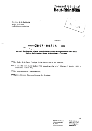portant fixation des prix de journée hébergement et dépendance 2007 de la maison de retraite "Home Saint Gilles" à COLMAR. Resumé Pièces jointes ARRETE Assemblée : Non défini Date : 09/03/2007 Rapporteur : Non défini Collectivité : Conseil départemental du Haut-Rhin Direction : Non défini Service : Service de la Tarification des Etablissements Domaine : Prix de Journée Commission :