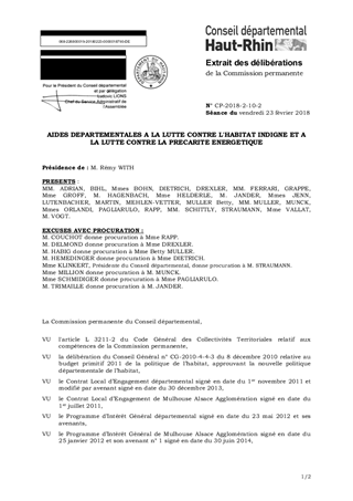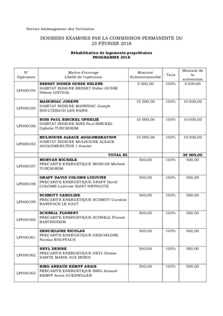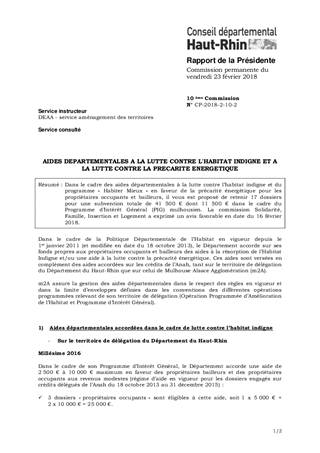 Dans le cadre des aides départementales à la lutte contre l’habitat indigne et du programme « Habiter Mieux » en faveur de la précarité énergétique pour les propriétaires occupants et bailleurs, il vous est proposé de retenir 17 dossiers pour une subvention totale de 41 500 € dont 11 500 € dans le cadre du Programme d’Intérêt Général (PIG) mulhousien. La commission Solidarité, Famille, Insertion et Logement a exprimé un avis favorable en date du 16 février 2018.