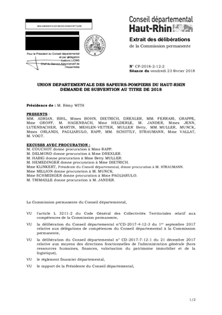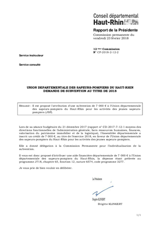 UNION DEPARTEMENTALE DES SAPEURS-POMPIERS DU HAUT-RHIN DEMANDE DE SUBVENTION AU TITRE DE 2018