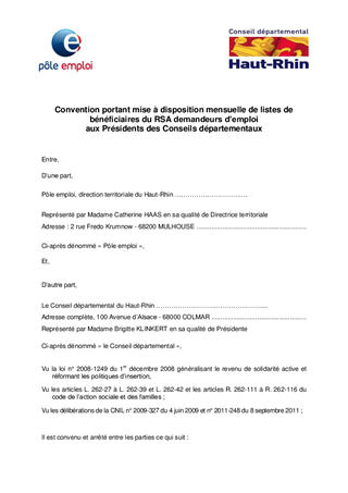 CONVENTION ENTRE POLE EMPLOI ET LE DEPARTEMENT PORTANT MISE A DISPOSITION MENSUELLE DE LISTES DE BENEFICIAIRES DU RSA DEMANDEURS D'EMPLOI