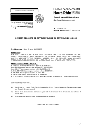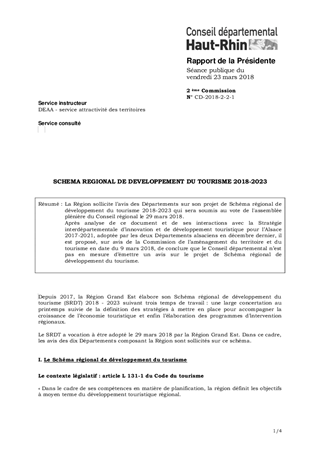 La Région sollicite l’avis des Départements sur son projet de Schéma régional de développement du tourisme 2018-2023 qui sera soumis au vote de l'assemblée plénière du Conseil régional le 29 mars 2018. Après analyse de ce document et de ses interactions avec la Stratégie interdépartementale d’innovation et de développement touristique pour l’Alsace 2017-2021, adoptée par les deux Départements alsaciens en décembre dernier, il est proposé, sur avis de la Commission de l’aménagement du territoire et du tourisme en date du 9 mars 2018, de conclure que le Conseil départemental n’est pas en mesure d’émettre un avis sur le projet de Schéma régional de développement du tourisme.