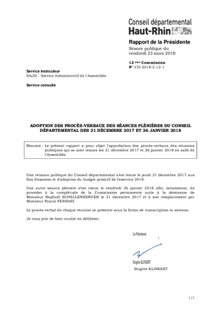 ADOPTION DES PROCÈS-VERBAUX DES SÉANCES PLÉNIÈRES DU CONSEIL DÉPARTEMENTAL DES 21 DÉCEMBRE 2017 ET 26 JANVIER 2018