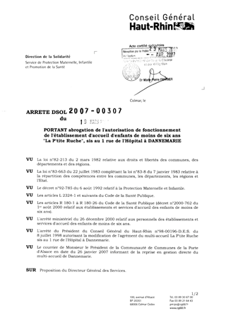 portant abrogation de l'autorisation de fonctionnement de l'établissement d'accueil d'enfants de moins de six ans "La P'tite Ruche", sis au 1 rue de l'Hôpital à DANNEMARIE. Resumé Pièces jointes ARRETE Assemblée : Non défini Date : 19/03/2007 Rapporteur : Non défini Collectivité : Conseil départemental du Haut-Rhin Direction : Non défini Service : Service de Protection Maternelle et Infantile Domaine : Accueil d'enfants Commission :