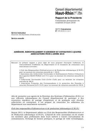 Le présent rapport a pour objet de vous proposer d’accepter l’adhésion, le renouvellement d'adhésion du Département et le versement de cotisations aux associations suivantes : • Club des Responsables d’Infrastructure et de Production informatique (C.R.I.P.) pour un montant de cotisation annuelle de 1 440 €. • Association des Collectivités Territoriales et Etablissements Publics Utilisateurs des Logiciels CEGID PUBLIC (A.C.T.U.) pour un montant de cotisation annuelle de 500 €. • Collectivités Territoriales Club (CoTer Club) pour un montant de cotisation annuelle de 480 €. • Association Française des Correspondants à la protection des Données à caractère Personnel (A.F.C.D.P.) pour un montant de cotisation annuelle de 450 €.