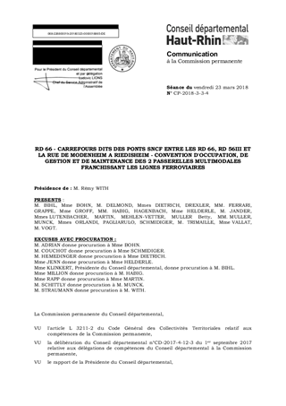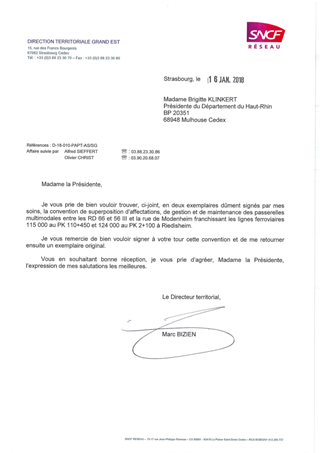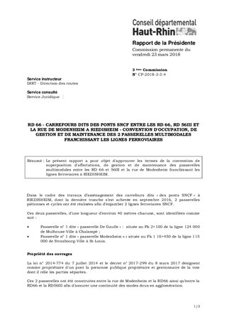 Le présent rapport a pour objet d'approuver les termes de la convention de superposition d'affectations, de gestion et de maintenance des passerelles multimodales entre les RD 66 et 56III et la rue de Modenheim franchissant les lignes ferroviaires à RIEDISHEIM.