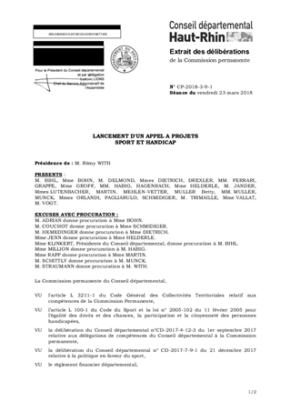Le présent rapport propose la validation d’un appel à projets, en direction des associations sportives haut-rhinoises, des comités départementaux sportifs, des ligues sportives Grand Est, de l’UNSS ainsi que des associations affiliées à l’UNSS, destiné à encourager l’intégration des personnes en situation de handicap dans les clubs sportifs et à faciliter leur accès à la pratique sportive. Des crédits spécifiques ont été prévus au BP 2018. Ce dossier a recueilli un avis favorable de la 9ème Commission du 09 février 2018.