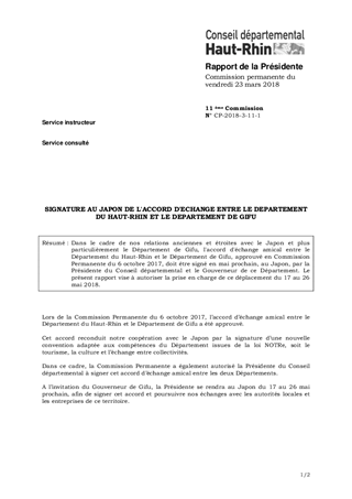 Dans le cadre de nos relations anciennes et étroites avec le Japon et plus particulièrement le Département de Gifu, l'accord d'échange amical entre le Département du Haut-Rhin et le Département de Gifu, approuvé en Commission Permanente du 6 octobre 2017, doit être signé en mai prochain, au Japon, par la Présidente du Conseil départemental et le Gouverneur de ce Département. Le présent rapport vise à autoriser la prise en charge de ce déplacement du 17 au 26 mai 2018.