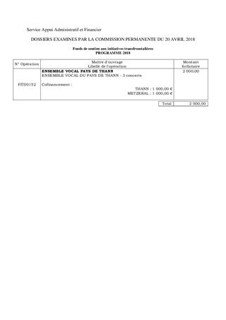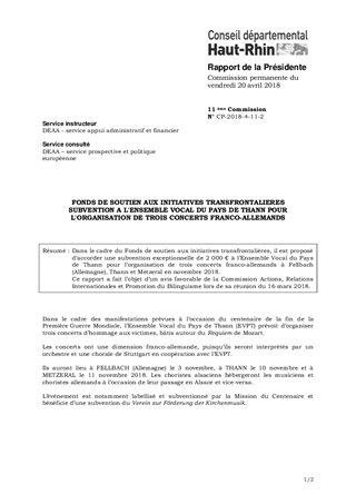 Dans le cadre du Fonds de soutien aux initiatives transfrontalières, il est proposé d’accorder une subvention exceptionnelle de 2 000 € à l’Ensemble Vocal du Pays de Thann pour l’organisation de trois concerts franco-allemands à Fellbach (Allemagne), Thann et Metzeral en novembre 2018. Ce rapport a fait l’objet d’un avis favorable de la Commission Actions, Relations Internationales et Promotion du Bilinguisme lors de sa réunion du 16 mars 2018.