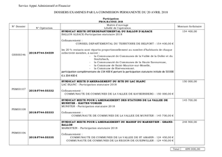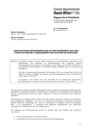 Le présent rapport a pour objet d'attribuer les participations statutaires du Département aux dépenses de fonctionnement des syndicats mixtes d'aménagement des stations de montagne du Lac Blanc, de la Vallée de Munster, du Markstein Grand-Ballon et du Ballon d'Alsace (SMIBA) pour un montant de 699 000 €. Lors de la Commission Permanente du 26 janvier 2018, un acompte de 50 000 € a déjà été attribué au SMIBA. Le montant total des participations pour l'année 2018 s'élève ainsi à 749 000 €. Ce rapport a fait l'objet d'un avis favorable de la Commission Agriculture, Environnement et Cadre de Vie lors de la réunion en date du 16 mars 2018.