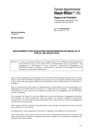 Il vous est proposé d'approuver le déplacement d'une délégation départementale en Israël du 27 juin au 1er juillet 2018. Ce déplacement aura pour thème : "De l'engagement à l'excellence" et sera consacré à l'innovation, l'engagement et l'économie sociale et solidaire. Il permettra de favoriser les échanges de bonnes pratiques et le partage d'expériences.