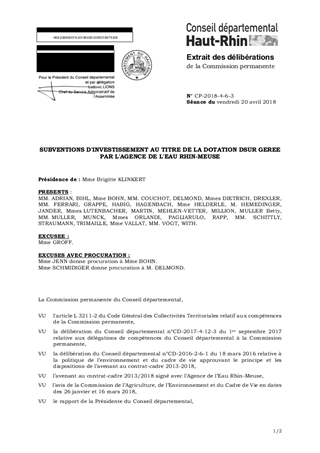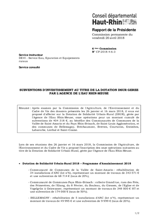Après examen par la Commission de l'Agriculture, de l'Environnement et du Cadre de Vie des dossiers présentés les 26 janvier et 16 mars 2018, il vous est proposé d'affecter sur la Dotation de Solidarité Urbain-Rural (DSUR), gérée par l'Agence de l'Eau Rhin-Meuse, onze opérations pour un montant cumulé de subventions de 404 318 €, au bénéfice des Communautés de Communes de la Vallée de Saint-Amarin et du Pays Rhin-Brisach, de Saint-Louis Agglomération, et des communes de Bellemagny, Bréchaumont, Bretten, Courtavon, Eteimbes, Labaroche, Linthal et Saint-Cosme.