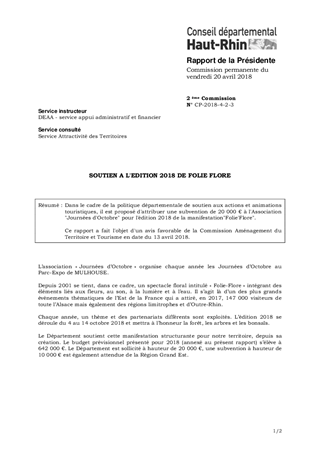 Dans le cadre de la politique départementale de soutien aux actions et animations touristiques, il est proposé d'attribuer une subvention de 20 000 € à l'Association "Journées d'Octobre" pour l'édition 2018 de la manifestation"Folie'Flore". Ce rapport a fait l'objet d'un avis favorable de la Commission Aménagement du Territoire et Tourisme en date du 13 avril 2018.
