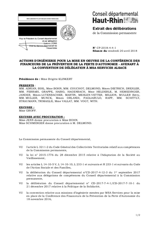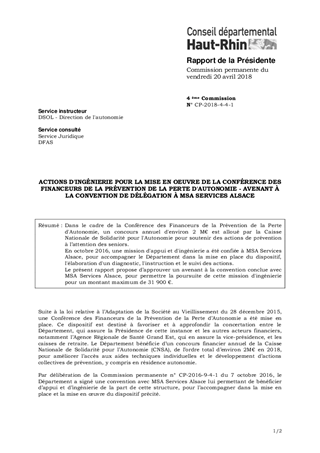 Dans le cadre de la Conférence des Financeurs de la Prévention de la Perte d'Autonomie, un concours annuel d'environ 2 M€ est alloué par la Caisse Nationale de Solidarité pour l'Autonomie pour soutenir des actions de prévention à l’attention des seniors. En octobre 2016, une mission d'appui et d'ingénierie a été confiée à MSA Services Alsace, pour accompagner le Département dans la mise en place du dispositif, l'élaboration d'un diagnostic, l'instruction et le suivi des actions. Le présent rapport propose d’approuver un avenant à la convention conclue avec MSA Services Alsace, pour permettre la poursuite de cette mission d'ingénierie pour un montant maximum de 31 900 €.