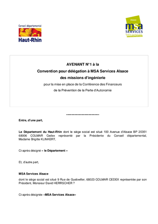 ACTIONS D'INGÉNIERIE POUR LA MISE EN OEUVRE DE LA CONFÉRENCE DES FINANCEURS DE LA PRÉVENTION DE LA PERTE D'AUTONOMIE - AVENANT À LA CONVENTION DE DÉLÉGATION À MSA SERVICES ALSACE