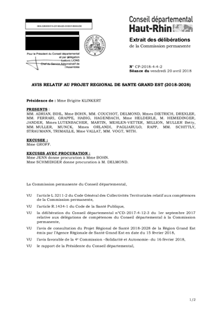 Conformément à l’article R. 1434-1 du Code de la Santé Publique, le Département du Haut-Rhin est consulté sur le Projet Régional de Santé (PRS) Grand Est 2018-2028. Le présent rapport a pour objet de rendre un avis circonstancié sur ce document, qui sera définitivement adopté par le Directeur Général de l’Agence Régionale de Santé (ARS) Grand Est en juin 2018.