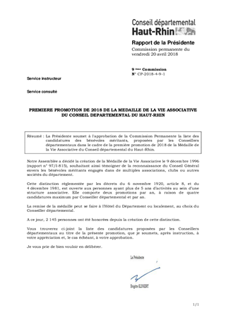 La Présidente soumet à l'approbation de la Commission Permanente la liste des candidatures des bénévoles méritants, proposées par les Conseillers départementaux dans le cadre de la première promotion de 2018 de la Médaille de la Vie Associative du Conseil départemental du Haut-Rhin.