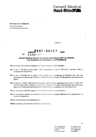 portant fixation des prix de journée dépendance 2007 de l'EHPAD "Les Fontaines de Lutterbach" à LUTTERBACH. Resumé Pièces jointes ARRETE Assemblée : Non défini Date : 28/03/2007 Rapporteur : Non défini Collectivité : Conseil départemental du Haut-Rhin Direction : Non défini Service : Service de la Tarification des Etablissements Domaine : Prix de Journée Commission :