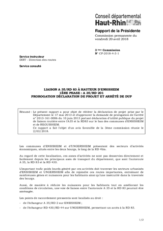 Le présent rapport a pour objet de réitérer la déclaration de projet prise par le Département le 17 mai 2013 et d’approuver la demande de prorogation de l’arrêté n° 2013-161-0006 du 10 juin 2013 portant déclaration d’utilité publique du projet de liaison routière entre l'A35 et la RD83 sur le ban des communes d'ENSISHEIM et de REGUISHEIM. Ce rapport a fait l'objet d'un avis favorable de la 3ème commission réunie le 2/03/2018.