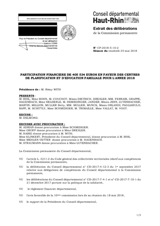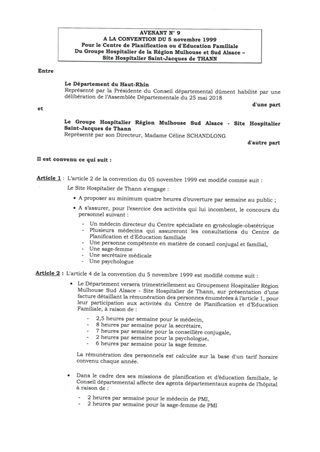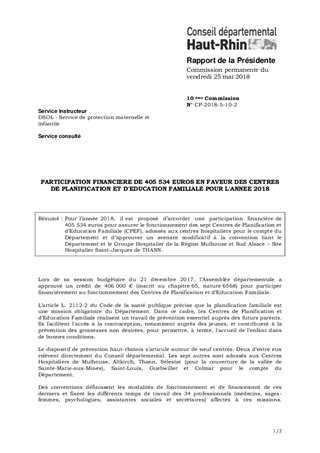 Pour l’année 2018, il est proposé d’accorder une participation financière de 405 534 euros pour assurer le fonctionnement des sept Centres de Planification et d’Education Familiale (CPEF), adossés aux centres hospitaliers pour le compte du Département et d’approuver un avenant modificatif à la convention liant le Département et le Groupe Hospitalier de la Région Mulhouse et Sud Alsace – Site Hospitalier Saint-Jacques de THANN.