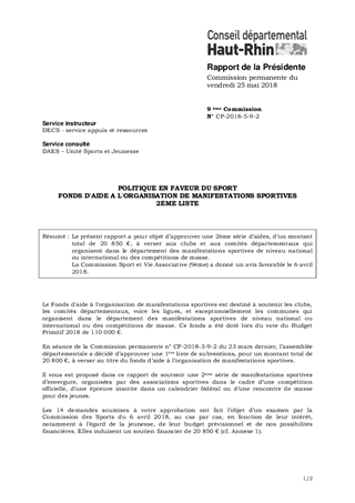 Le présent rapport a pour objet d’approuver une 2ème série d’aides, d’un montant total de 20 850 €, à verser aux clubs et aux comités départementaux qui organisent dans le département des manifestations sportives de niveau national ou international ou des compétitions de masse. La Commission Sport et Vie Associative (9ème) a donné un avis favorable le 6 avril 2018.
