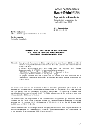 Il est proposé d’approuver la 3ème programmation pour l’année 2018 des aides à attribuer aux projets structurants inscrits dans les Contrats de Territoire de Vie (CTV) 2014 2019. 3 projets structurants sont concernés pour un montant total d’aides départementales de 175 658 € réparties de la façon suivante : - CTV Florival Vignoble Plaine du Rhin : 148 150 € pour 2 projets, - CTV Région Mulhousienne : 27 508 € pour 1 projet. Les projets inscrits dans ce rapport ont fait l’objet d’un avis favorable de la Commission Patrimoine Immobilier, Actions et Territoires lors de sa réunion du 13 avril 2018.