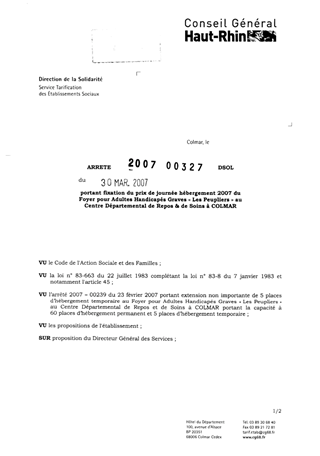 portant fixation du prix de journée hébergement 2007 du foyer pour adultes handicapés graves "Les Peupliers" au centre départemental de repos et de soins à COLMAR. Resumé Pièces jointes ARRETE Assemblée : Non défini Date : 30/03/2007 Rapporteur : Non défini Collectivité : Conseil départemental du Haut-Rhin Direction : Non défini Service : Service de la Tarification des Etablissements Domaine : Prix de Journée Commission :
